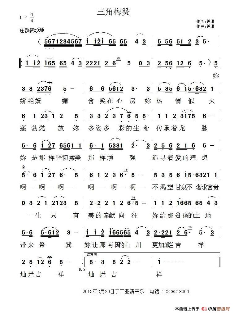 好!!作者姜先生的作品堪与词曲名家媲美。歌词优美带着作者深厚的感情,也充分展示了作者广博的文化底蕴和对音乐较深的造诣。建议此歌曲可以通过有实力的歌唱家推到春晚上,让更多的观众欣赏!祝愿《三角梅赞》这首歌能从网络唱响大江南北! [回复]