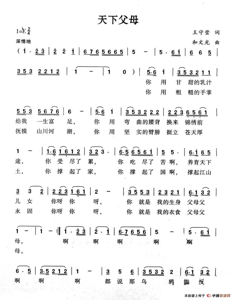 当前位置: 首页 民歌曲谱 四字歌名 天下父母(王守莹词 和文光曲)