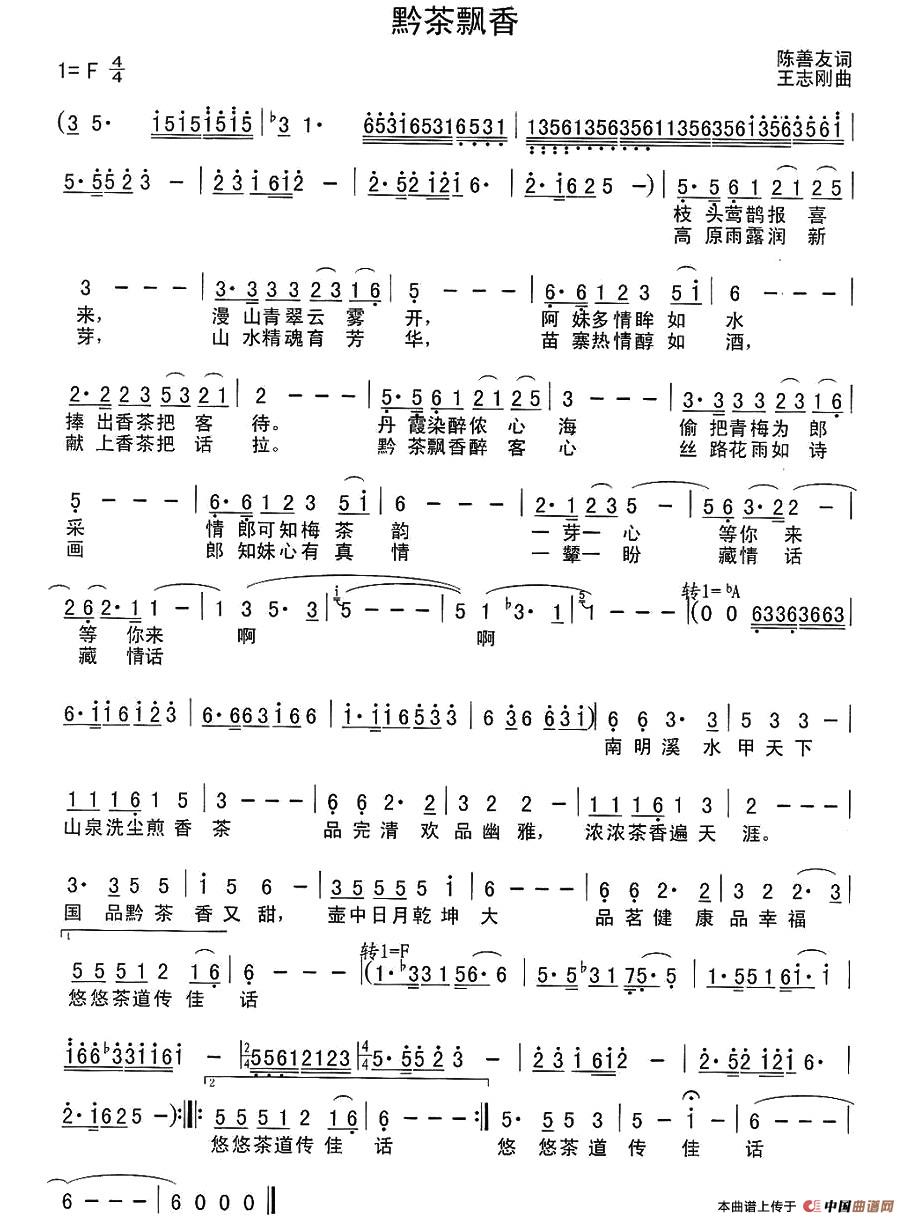 枝头莺鹊报喜来, 漫山青翠云雾开。 阿妹多情眸如水, 捧出香茶把客待。 丹霞染醉侬心海, 偷把青梅为郎采。 情郎可知梅茶韵, 一芽一心等你来 等你来。 高原雨露润新芽, 山水精魂育芳华。 苗寨热情醇如酒, 献上香茶把话拉。 黔茶飘香醉客心, 丝路花雨如诗画。 郎知妹心有真情, 一颦一盼藏情话 藏情话。 啊 啊 啊 啊 南明溪水甲天下, 山泉洗尘煎香茶。 品玩清欢品幽雅, 浓浓茶香遍天涯。 国品黔茶香又甜, 壶中日月乾坤大。 品茗健康品幸福, 悠悠茶道传佳话。 悠悠茶道传佳话。 |