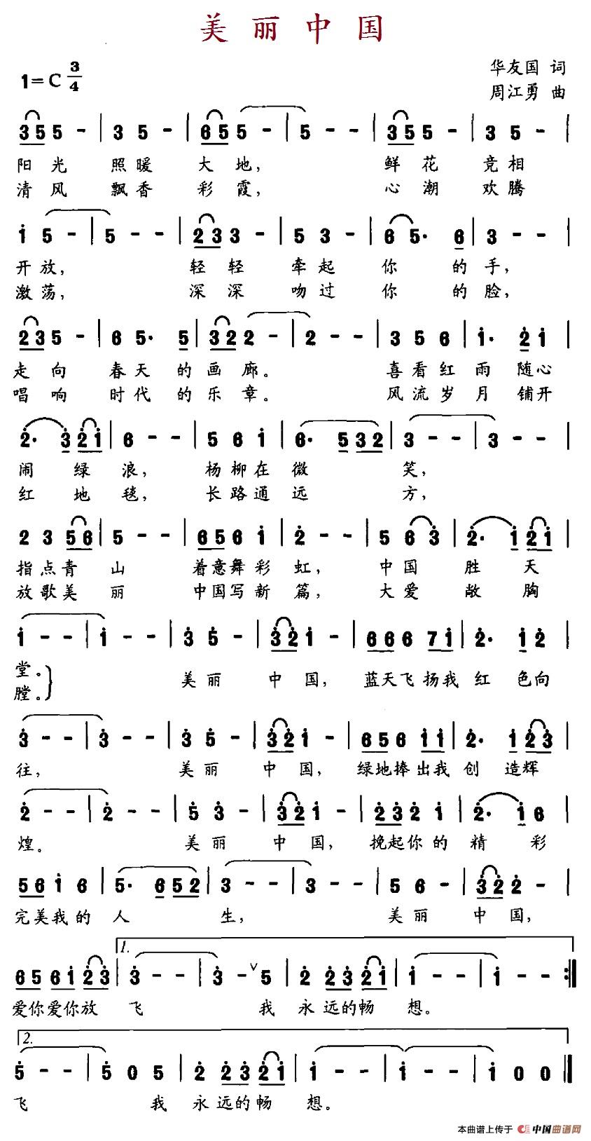 当前位置: 首页 民歌曲谱 四字歌名 美丽中国(华友国词 周江勇曲)