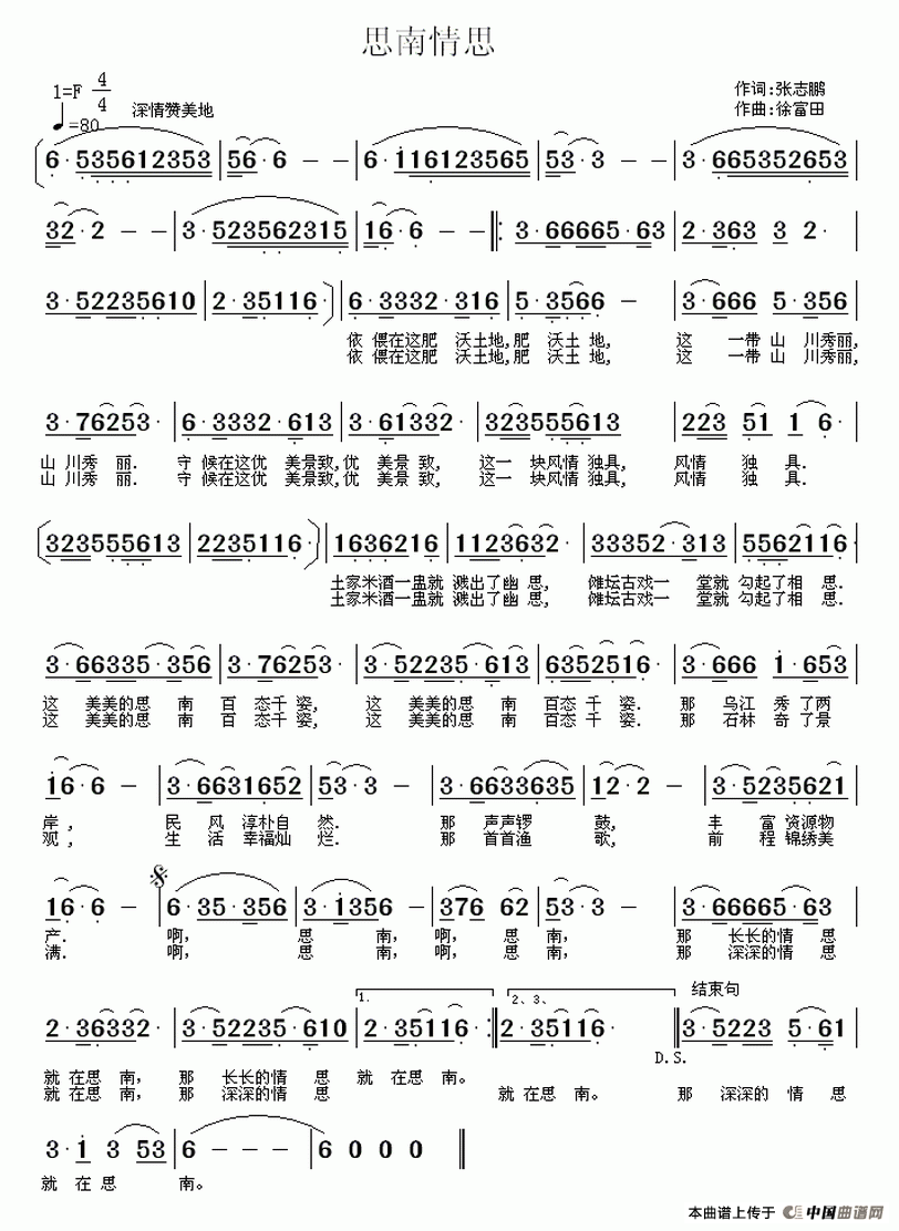 词:张志鹏 曲/编:徐富田 唱:菁菁 依偎在这肥沃土地 肥沃土地 这一带山川秀丽 山川秀丽 守候在这优美景致 优美景致 这一块风情独具 风情独具 土家米酒一盅 就溅出了幽思 傩坛古戏一堂 就勾起了相思 这美美的思南 百态千姿 这美美的思南 百态千姿 那乌江秀了两岸 民风淳朴自然 那声声锣鼓 丰富资源物产 啊 思南 啊 思南 那长长的情思 就在思南 那长长的情思 就在思南 依偎在这肥沃土地 肥沃土地 这一带山川秀丽 山川秀丽 守候在这优美景致 优美景致 这一块风情独具 风情独具 土家米酒一盅 就溅出了幽思 傩坛古戏一堂 就勾起了相思 这美美的思南 百态千姿 这美美的思南 百态千姿 那石林奇了景观 生活幸福灿烂 那首首渔歌 前程锦绣美满 啊 思南 啊 思南 那深深的情思 就在思南 那深深的情思 就在思南 啊 思南 啊 思南 那深深的情思 就在思南 那深深的情思 就在思南 那深深的情思 就在思南 |