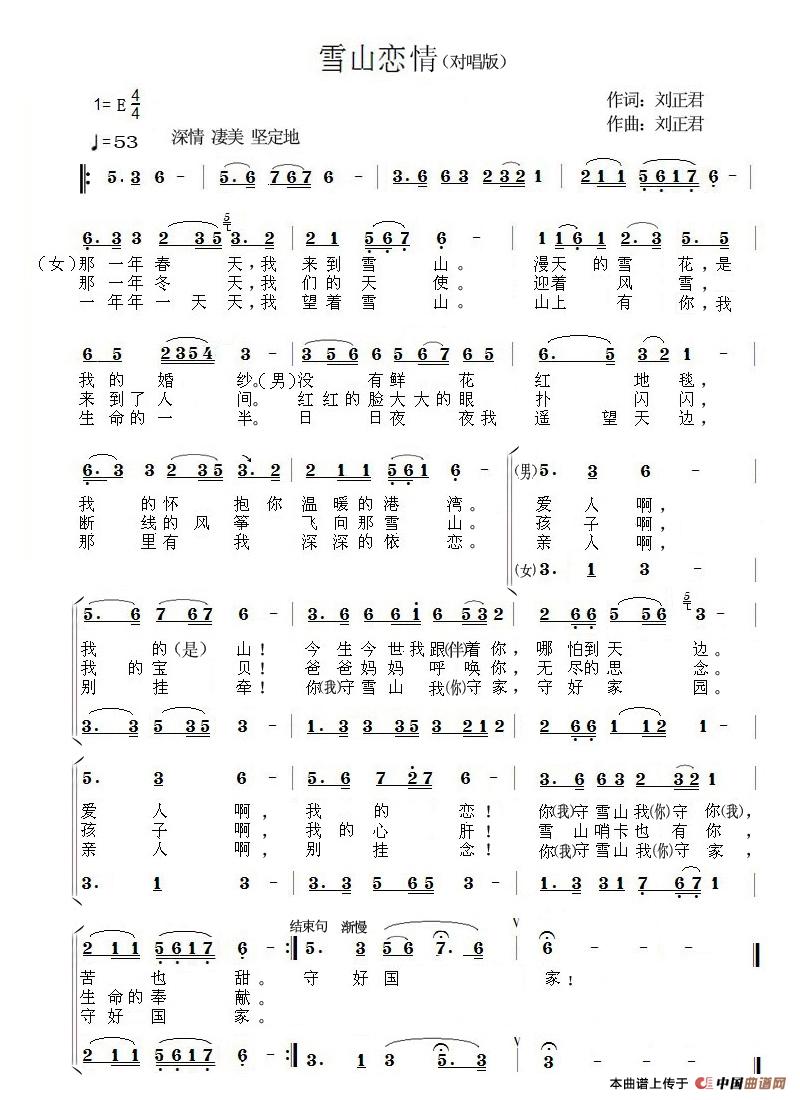 作词:八一真诚(刘正君) 作曲:八一真诚(刘正君) 编曲:仁青(藏族) 演唱:洛松群培(藏族)VS罗珍(藏族) 独白:西藏森林总队一名军官在雪山与妻子举办了婚礼,但由于高原缺氧,他们的孩子出生后不幸夭折。夫妻俩满含热泪,从心底唱出了这首歌。 女:那一年春天我来到雪山 漫天的雪花是我的婚纱 男:没有鲜花红地毯 我的怀抱 你温暖的港湾 合:爱人啊(na),我是(的)山 今生今世我伴(跟)着你 哪怕到天边 爱人啊(na),我的恋 我(你)守雪山你(我)守我(你) 苦也甜 女:那一年冬天我们的天使 迎着风雪来到了人间 男:红红的脸 大大的眼 扑闪闪 断线的风筝飞向那雪山 合:孩子啊,我的宝贝, 爸爸妈妈呼唤你 无尽的思念 孩子啊,我的心肝, 雪山哨卡也有你 生命的奉献 女:一年年一天天我望着雪山 山上有你 我生命的一半 男:日日夜夜我遥望天边 那里有我深深的依恋 合:亲人啊(na),别挂牵, 我(你)守雪山你(我)守家 守好家园 亲人啊(na),别挂念 守好雪山守好家 守好国家 守好国家! |