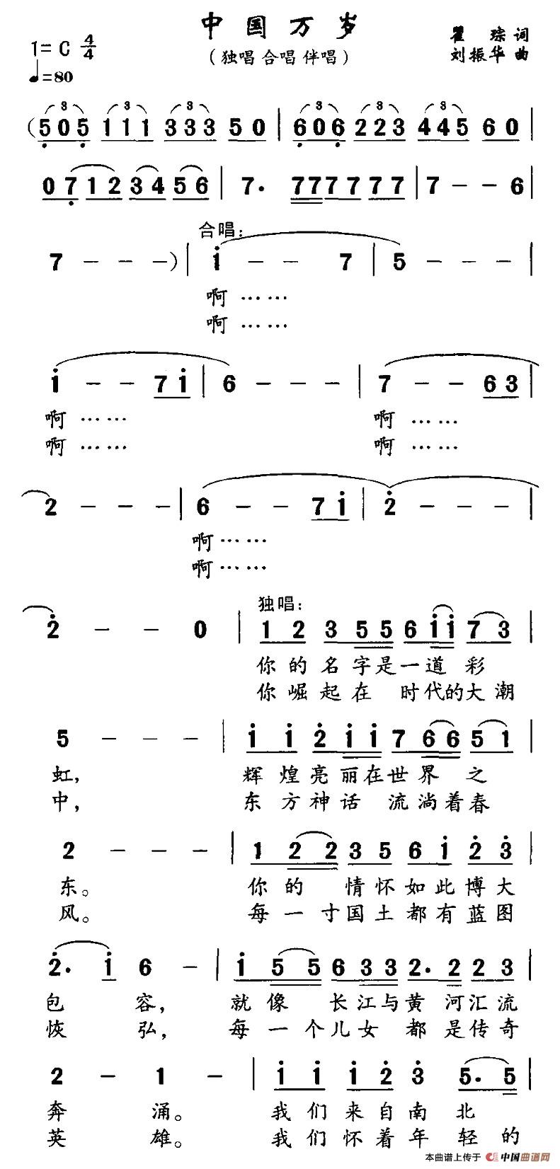 当前位置: 首页 民歌曲谱 四字歌名 中国万岁(瞿琮词 刘振华曲)