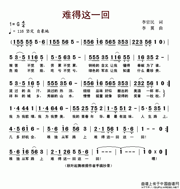 男声齐唱《难得这一回》轻松、愉快的音乐主题表达了年轻军人对祖国“艰苦不觉得苦,劳累不觉得累,我的青春华年最有滋味”的宽广胸襟和乐观的人生!