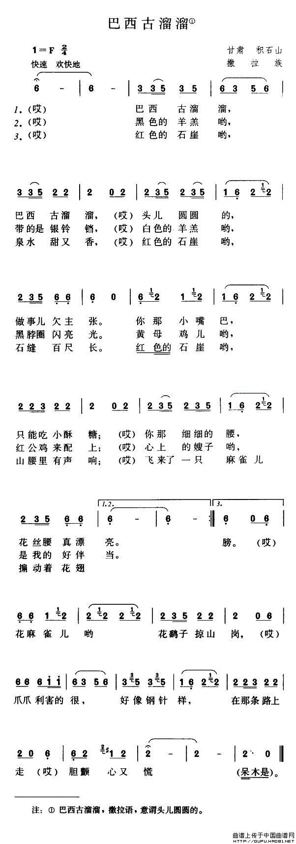 这是流传于甘肃积石山撒拉族的一首民歌。从体裁而言,这首民歌就是撒拉族的“玉儿”,而且,无论词曲,都具备了“玉儿”的典型特征。《巴西古溜溜》是一个包含了某种对比因素的民间二部曲式。
