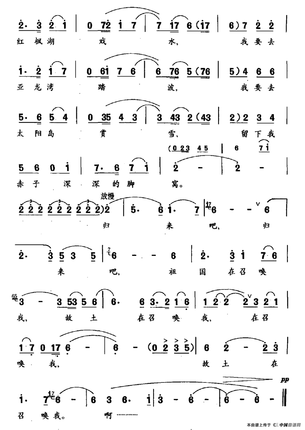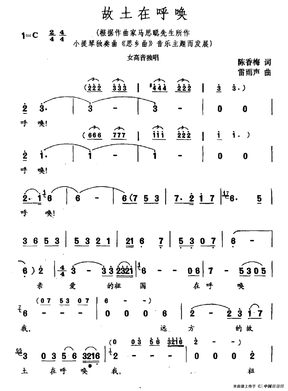 关于《故土在呼唤》曲谱的评论