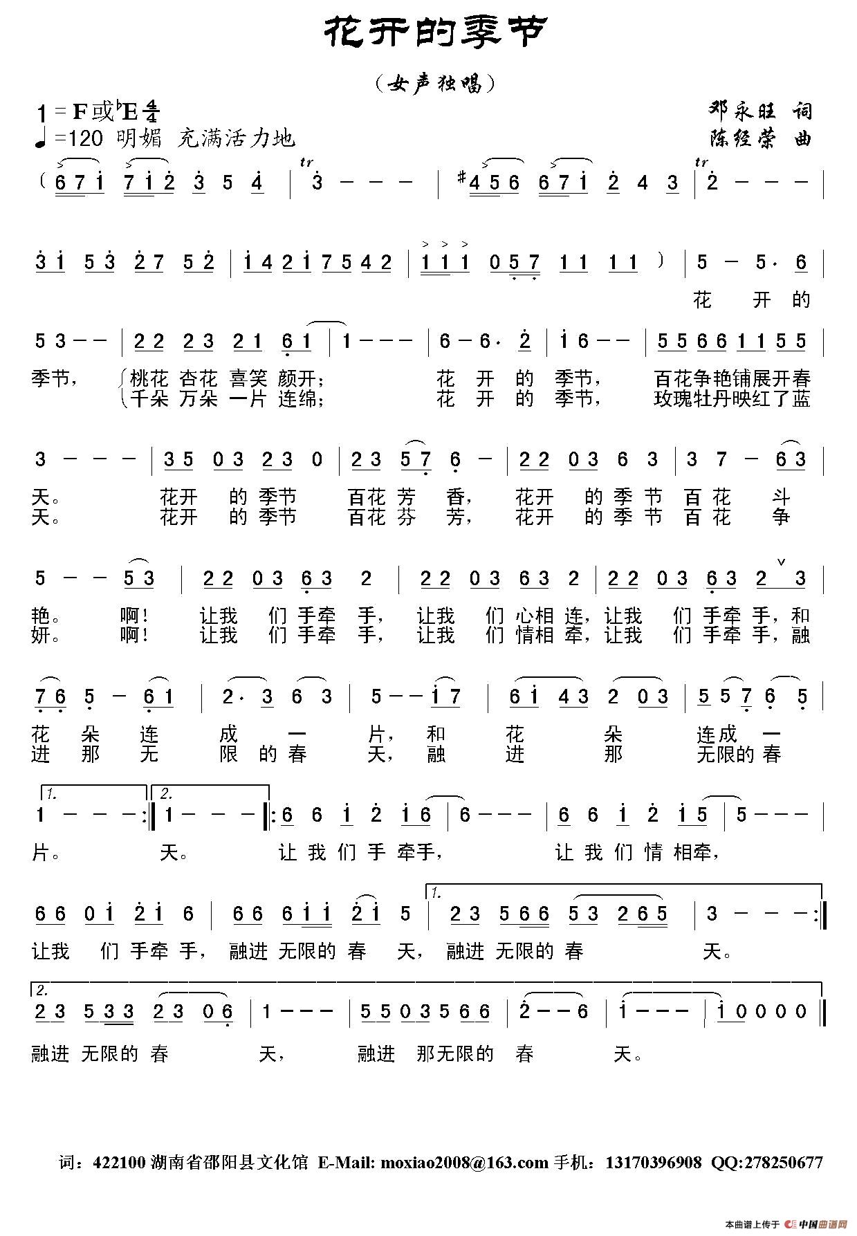 当前位置: 首页 民歌曲谱 五字歌名 花开的季节(邓永旺词 陈经荣曲)