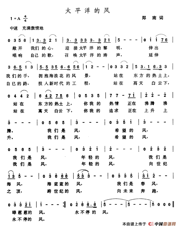 当前位置: 首页 民歌曲谱 五字歌名 太平洋的风(郑南词 张玉晶曲)
