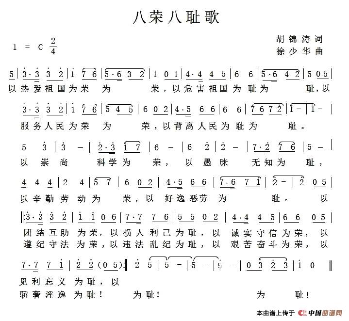关于《八荣八耻歌》曲谱的评论