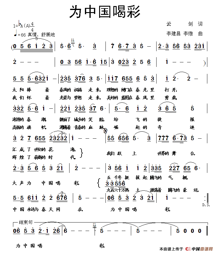 当前位置: 首页 民歌曲谱 五字歌名 为中国喝彩(云剑词 李建昌曲)