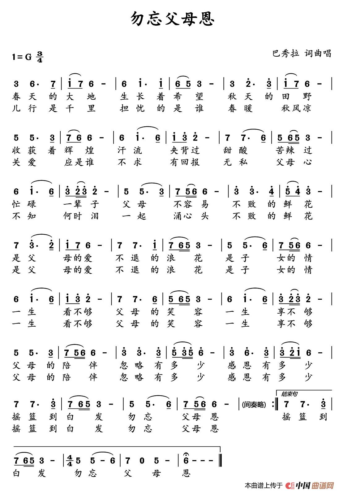 《勿忘父母恩》报答父母的养育之恩,是为人子女者一辈子应该努力去做的事情。试想一下,摇篮里的婴幼儿没有父母的呵护会怎样?没有父母生养我们是看不到 这个美丽世界的 。父母是对子女最无私、最关爱、最贴心、最亲近、最值得信赖的 人, 是视子女为命根子的人 。父母的恩情让我感受到这个世界的完美! 祝天下所有的父母亲健康长寿,多多享受儿女的孝敬和爱戴!