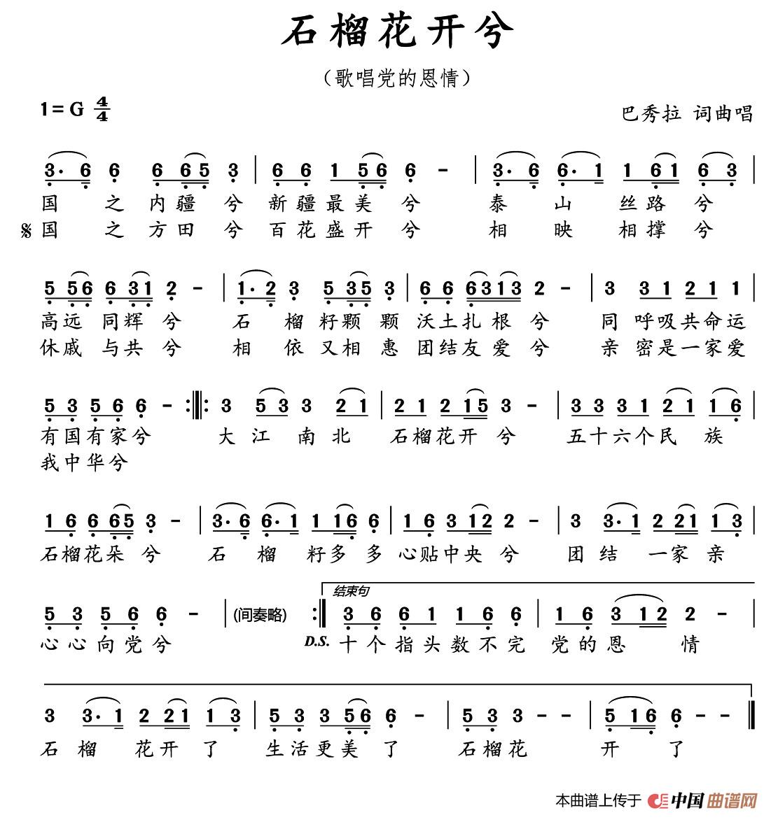 《石榴花开了》这是作者歌唱党的恩情的歌曲 。我热爱党,热爱社会主义祖国。作为中共党员我自豪。“没有共产党就没有新中国”这是千古不变的真理! 是中国共产党,开启了中国历史的新纪元。在中国共产党的领导下,亿万中国人民艰苦创业,努力探索中国特色社会主义的发展道路,在改革开放和现代化建设的历程中,创造了一个又一个奇迹,实现着强国富民、民族复兴的百年梦想。当今之中国,到处充满勃勃生机,各项事业蒸蒸日上,中国特色社会主义事业显示出强大的生命力。改革开放,使中国一步步走向繁荣昌盛,华夏儿女们安居乐业。56个兄弟民族是一家,是56朵盛开的石榴花,都在祖国的怀抱,都在党的阳光照耀下过着幸福美满的生活。党的恩情说不完。我们要像石榴那样紧密团结在党中央周围,建设我们共同的家园 。