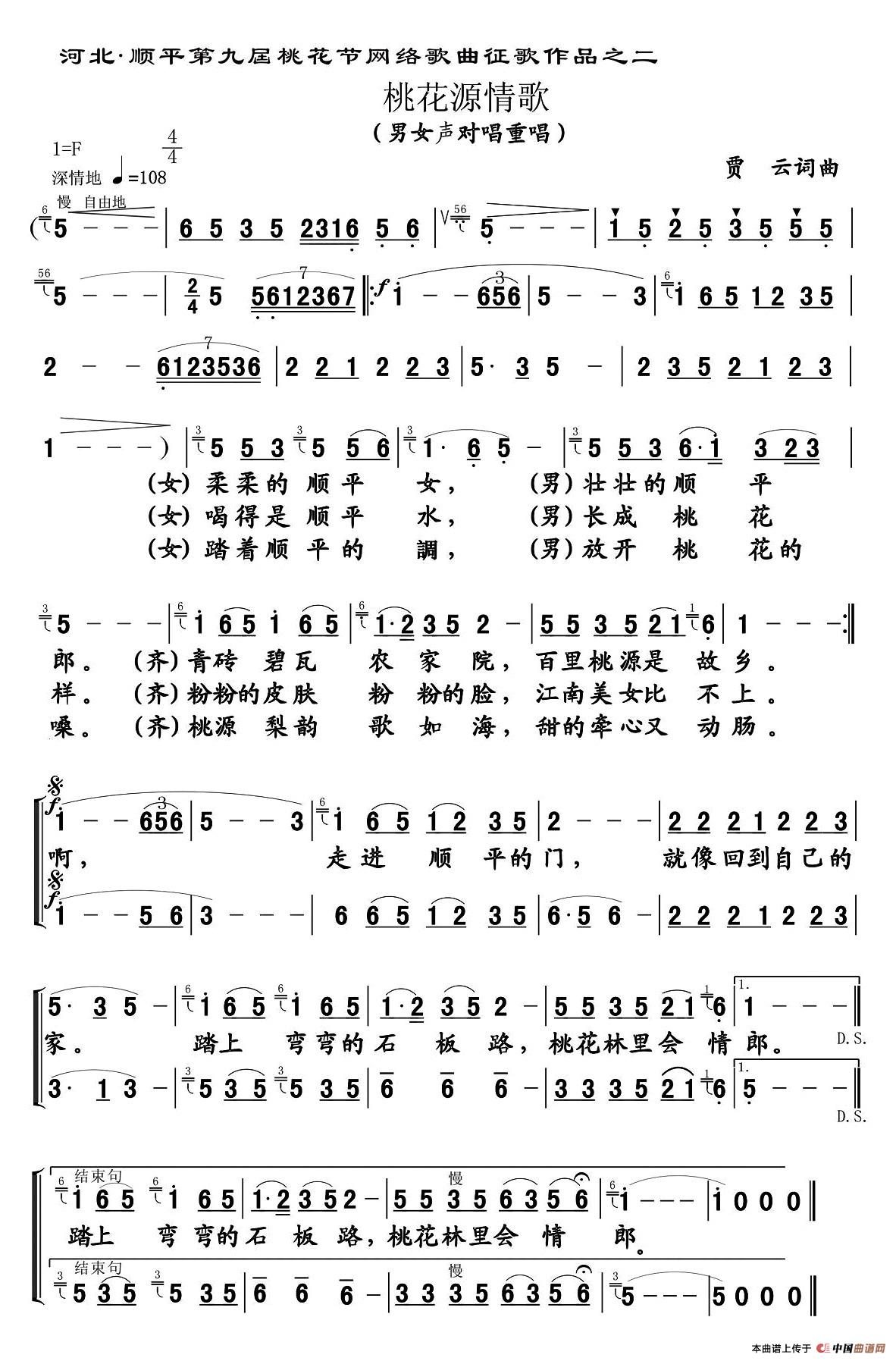 这是一首现代民歌版的情歌对唱。是参加河北顺平县首届桃花艺术节征歌作品。优美的旋律,幽雅的词韵把你带到顺平桃花源曲径通幽的小道。