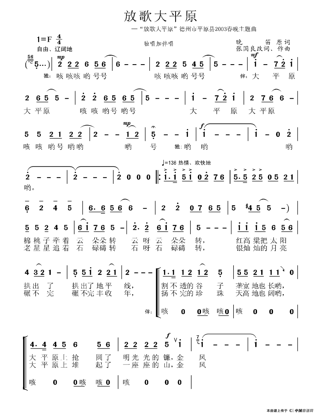 版本二 选自《放歌大平原》 致谢:《中国曲谱网》衷心感谢作者老师馈赠原版歌谱!