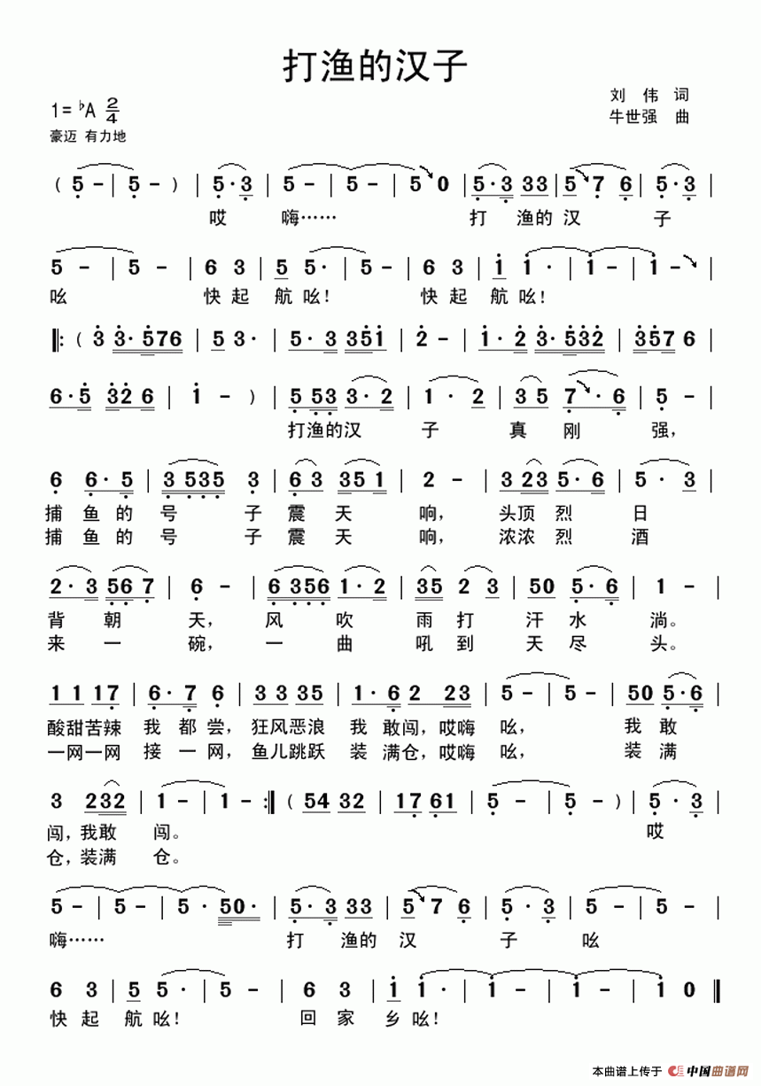 作词 刘 伟 作曲 牛世强 演唱 冬雪萧航 哎 嗨... 打 渔的汉子 吆 快起航吆快起航吆 打渔的汉子真刚强 捕鱼的号子震天响 头顶 烈日背朝天 风吹雨打汗水淌 酸甜苦辣我都尝 狂风恶浪我敢闯 哎嗨吆我敢闯我敢 闯 打渔的汉子真刚强 捕鱼的号子震天响 浓浓烈酒来一碗 一曲吼到天尽头 一网一网接一网 鱼儿跳跃装满仓 哎嗨吆装满仓装满仓 哎 嗨...打 渔的汉子吆 快起航吆.....回家乡吆 ... |