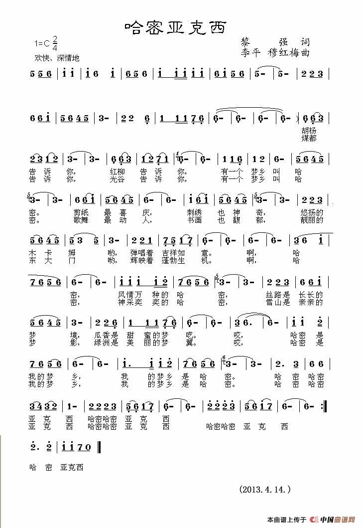 非常感谢黎强老师的美词,曲作者对歌词结尾有所改动,因而将歌名改为《哈密亚克西》,在这里更感谢我的搭档红梅的精诚合作,希望这首《哈密亚克西》能得到基地朋友们的支持。