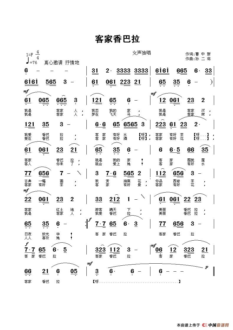 作词:曹中新 作曲:孙二将 编曲:孙二将 演唱:易丹丹 我是客家人, 我恋我的家, 我是客家汉, 我爱香巴拉, 客家有好水呀, 客家有好茶呀, 客家香巴拉, 就是我的家! 客家围拢屋, 古典一幅画, 我赏油菜花, 你品西岩茶, 客家红土地, 游客满天下, 美丽香巴拉, 日夜放光华! 我是客家人, 梦在飞天马, 我是客家妹, 爱在香巴拉, 客家有好酒呀, 客家有好花呀, 客人你来了, 就会爱上她! 客家有好水, 客家有好茶, 客家有好景, 客家有好花, 我是客家人, 我爱香巴拉, 美丽香巴拉, 人人喜欢她! 客家香巴拉, 客家香巴拉, 客家香巴拉, 客家香巴拉, 客家香巴拉, 客家香巴拉! |