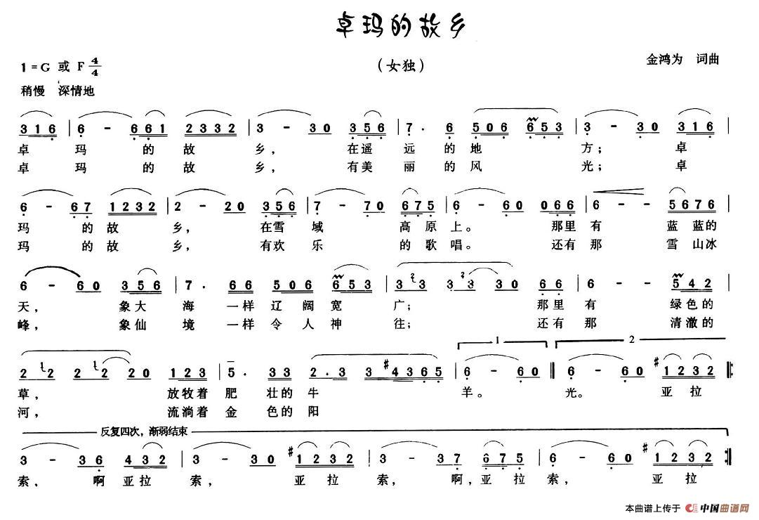 当前位置: 首页 民歌曲谱 五字歌名 卓玛的故乡(金鸿为 词曲)