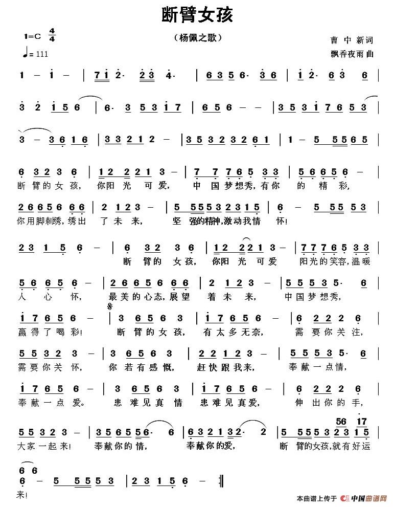 《断臂的女孩》这首歌是我今年5月3日晚看了浙江卫视《中国梦想秀》无臂女孩的十字绣梦的动人故事后创作的——失去双臂的杨佩是位超坚强的好女孩——看了她身残志不残用双脚刺绣笑对人生的艰苦奋斗乐观画面之后,我被她的坚强和乐观而感动流泪,因此为她写了《断臂的女孩》与《维纳斯的美》这二首歌,赞美她在逆境中坚强的生活精神。希望大家都能给这位无臂女孩送去一份精神食粮,给她送去心灵上的关爱!