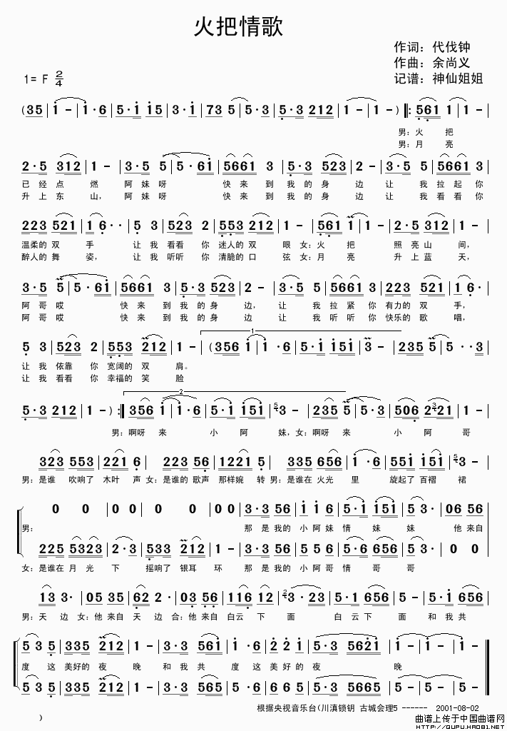 作词:代伐钟   作曲:余尚义   演唱(奏):不详   格式:简谱   来源:神仙姐姐记谱   上传:神仙姐姐   日期:2012-01-22   浏览次数: