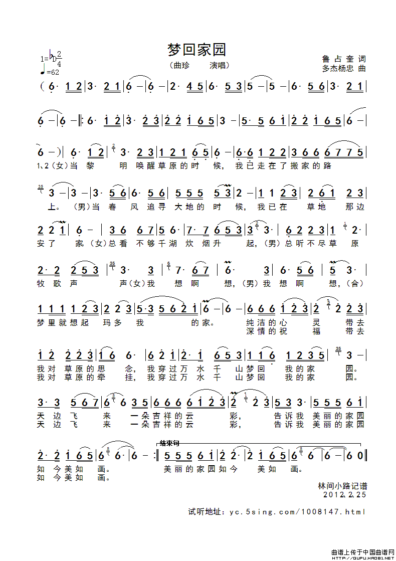 关于《梦回家园》曲谱的评论