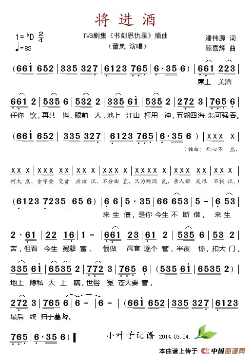 关于《将进酒(电视剧《书剑恩仇录》插曲)》曲谱的评论