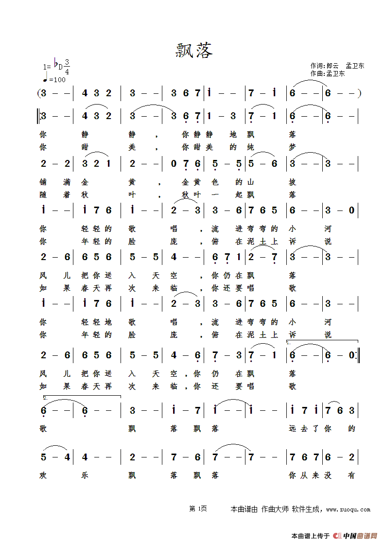 关于《飘落》曲谱的评论