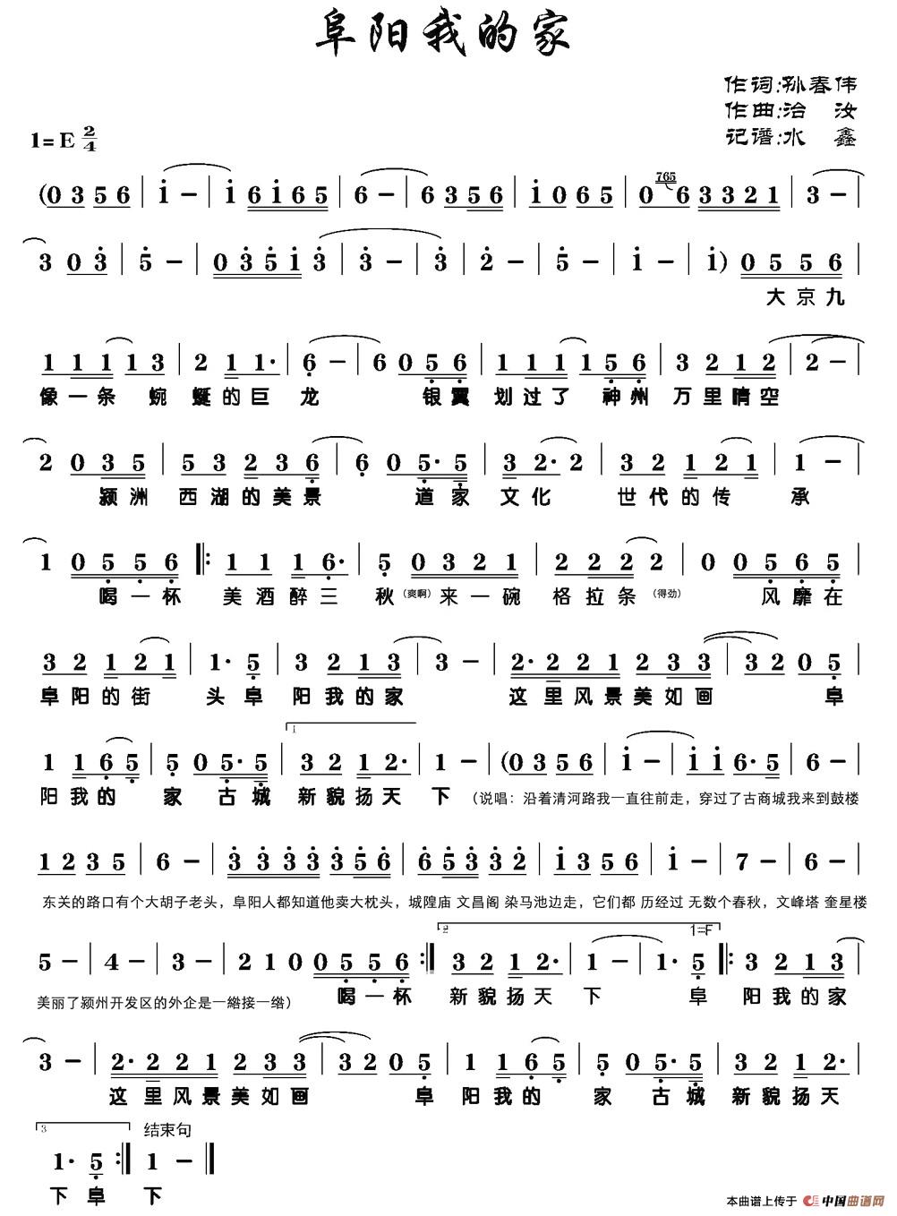 关于《阜阳我的家》曲谱的评论