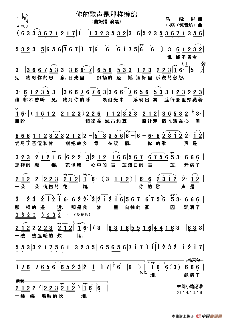 2014年9月,藏族实力女歌手曲姆措,即歌曲《我心上的人》之后,和著名音乐人小磊再次合作,推出第二首主打单曲《你的歌声是那样的缠绵》,歌曲深情大气、悠长绵延,歌手曲姆措沁人心魄的嗓音,加之音乐人小磊打动人心的创作,精湛的编曲,使浓浓的思乡之情,更富有一副温暖动人的画面!