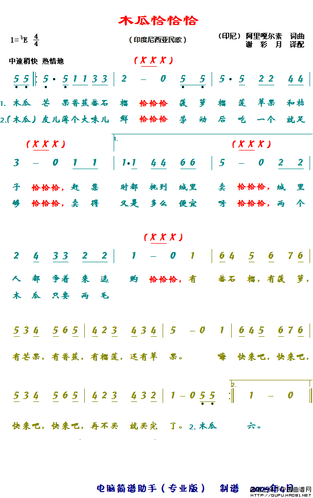 印度尼西亚民歌,“电脑简谱助手”样稿。方正卡通字体,辅以色彩变化,烘托气氛。
