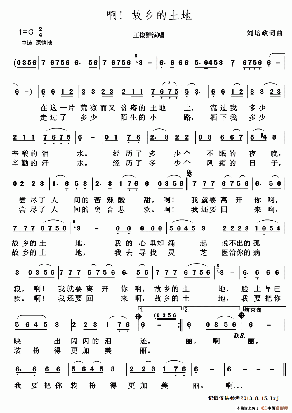 作词:刘培政 作曲:刘培政 演唱(奏):王俊雅 来源:民歌迷 记谱 上传:秋叶起舞