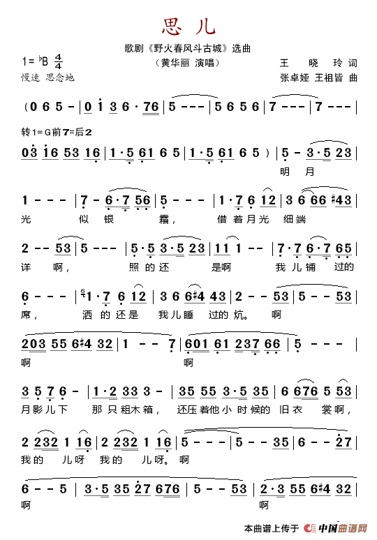 《思儿》歌曲感人动听,我已找了好久了。感谢《中国曲谱网》的最新发表,感谢小叶子老师的记谱上传,该谱记得准确无误,太好了。另外,我还有一事相求,就是歌剧《野火春风斗古城》中的《玉镯》选段,是杨母和银环的对唱(由黄华丽、孙丽英演唱),很好听。请小叶子老师能够帮助记谱上传,在此表示非常感谢! [回复]