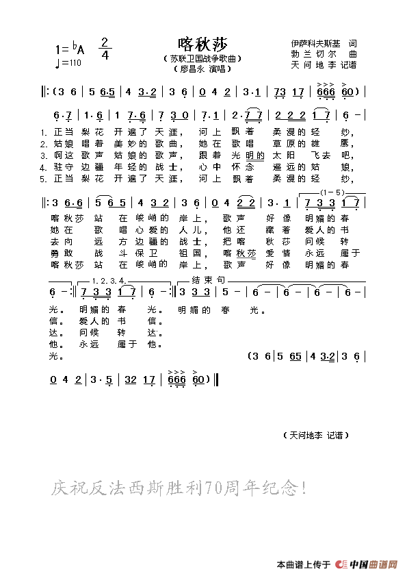 前苏联卫国战争名曲,据酷狗音乐mp3廖昌永演唱视频记谱制作。