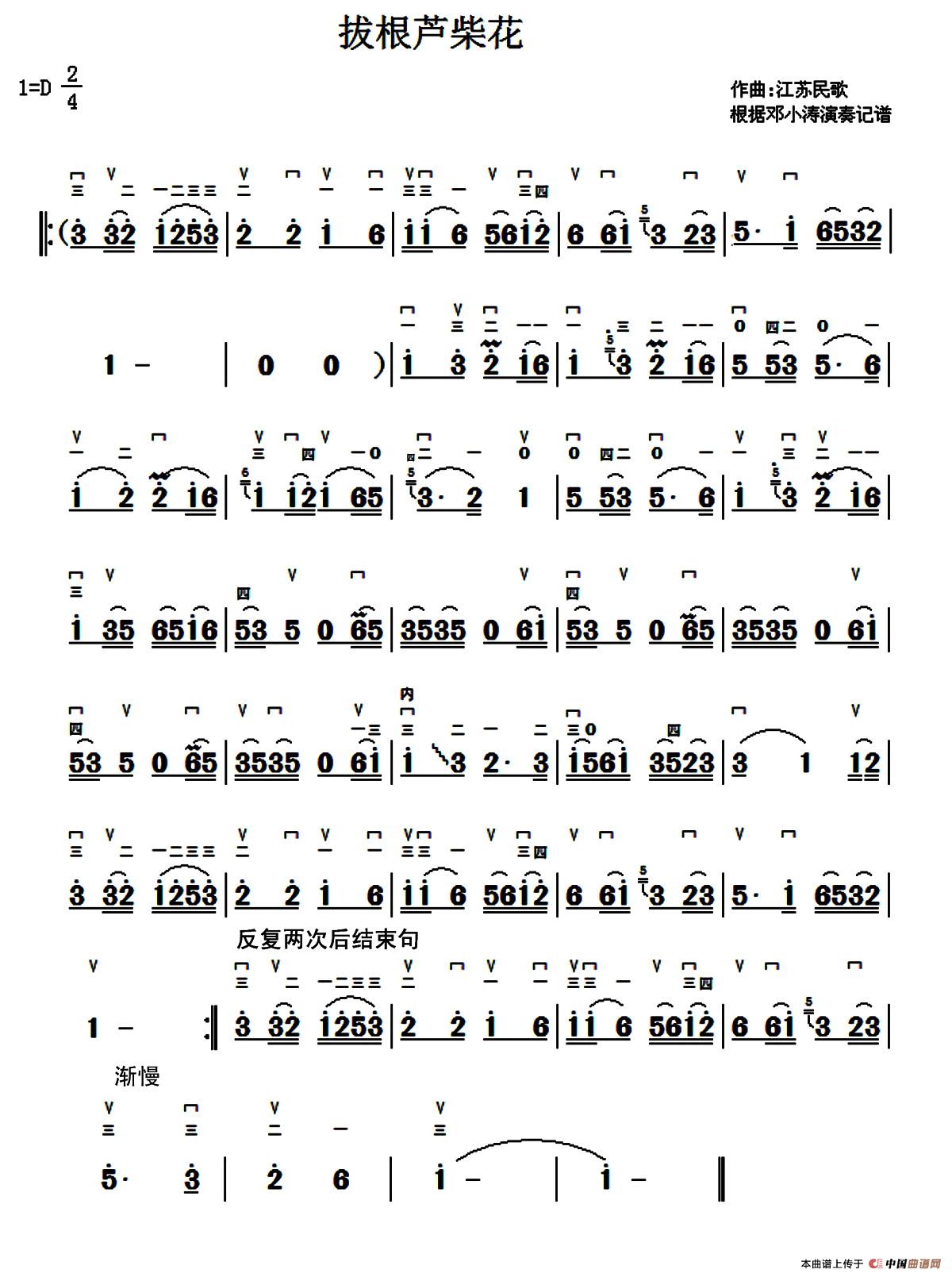 根据邓小涛先生演奏记谱。原曲伴奏过门有些长,仅记最后一句。记谱不一定准,仅供参考并请指正。