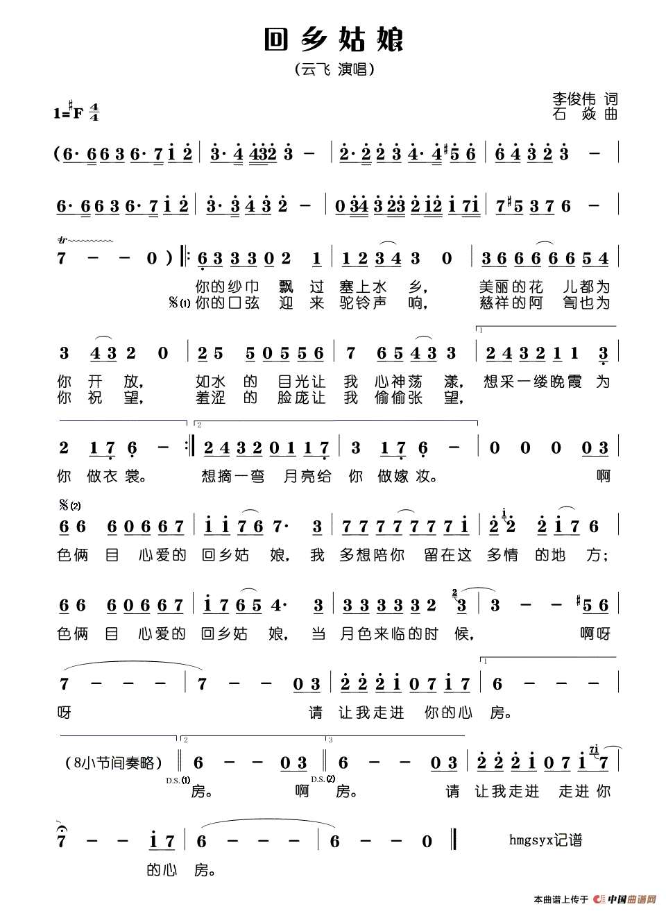 致谢:《中国曲谱网》衷心感谢记谱老师馈赠歌谱!