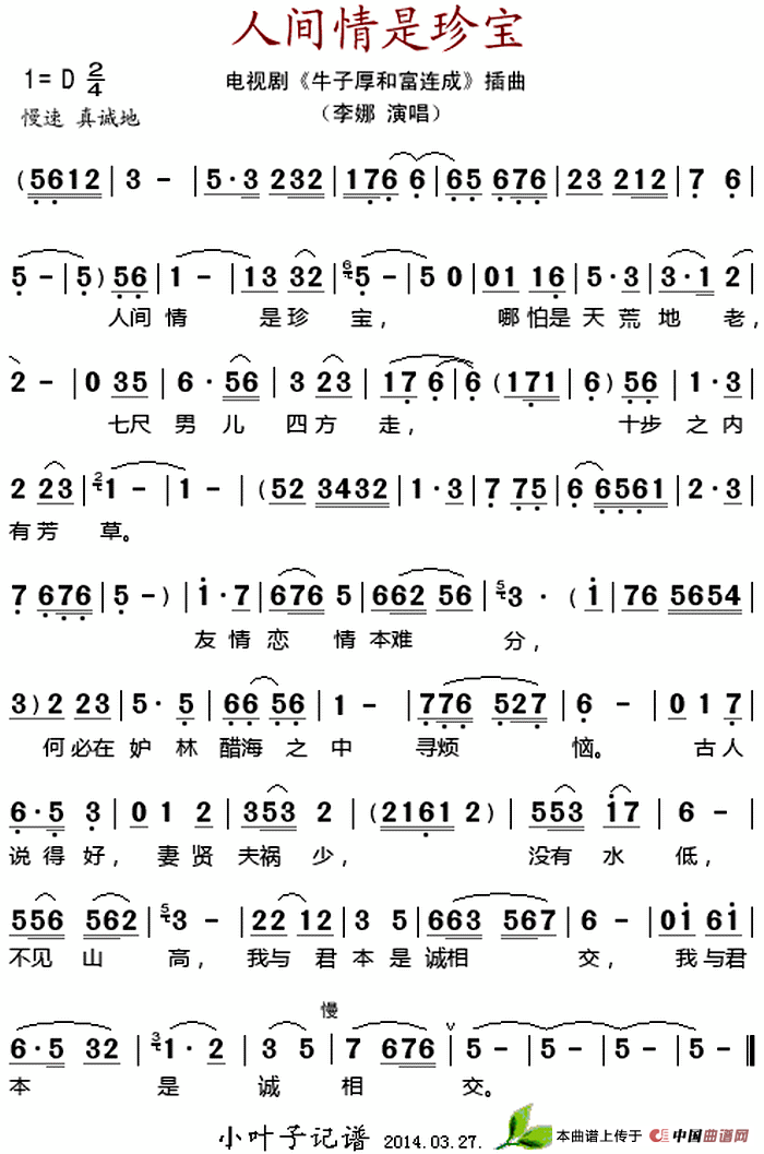 关于《人间情是珍宝》曲谱的评论
