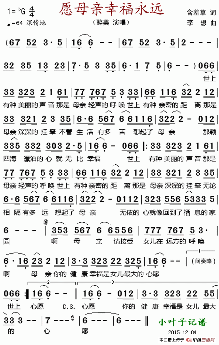 关于《愿母亲幸福永远 》曲谱的评论