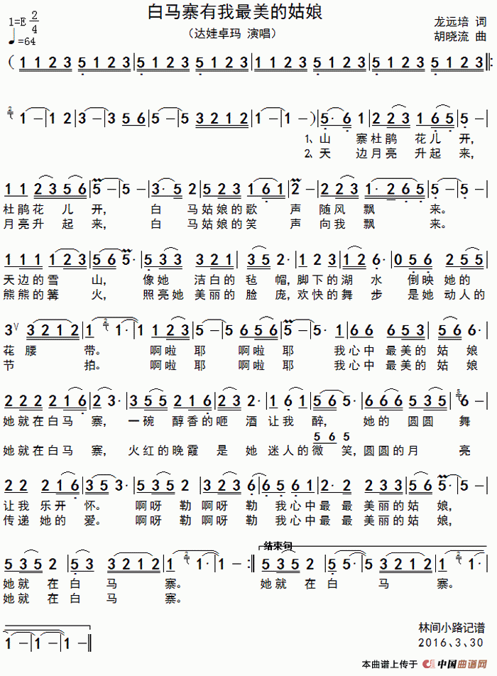 关于《白马寨有我最美的姑娘》曲谱的评论
