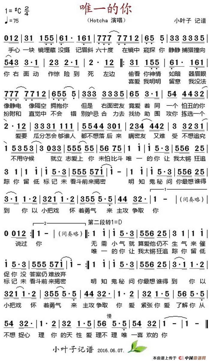 演唱(奏):Hotcha 来源:小叶子记谱制谱 上传:热爱音乐88