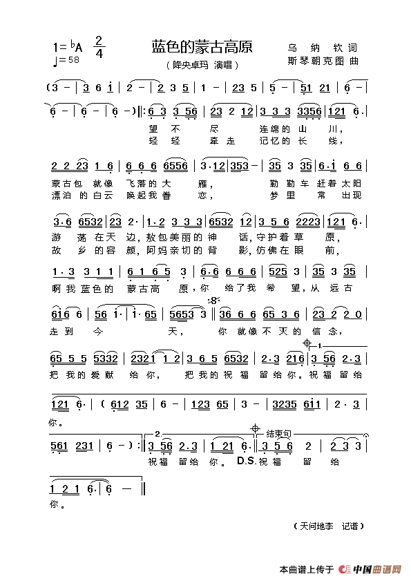 望不尽连绵的山川,蒙古包就象飞落的大雁,勒勒车赶着太阳游荡在天边,敖包美丽的神话守护着草原。啊我蓝色的蒙古高原,你给了我希望,从远古走到今天,你就像不灭的信念,把我的爱献给你,把我的祝福留给你,祝福留给你。(Music)轻轻牵走记忆的长线,漂泊的白云唤起我眷恋,梦里常出现故乡的容颜,阿妈亲切的背影,仿佛在眼前。啊我蓝色的蒙古高原,你给了我希望,从远古走到今天,你就像不灭的信念,把我的爱献给你,把我的祝福留给你,祝福留给你,你就像不灭的信念,把我的爱献给你,把我的祝福留给你,祝福留给你。