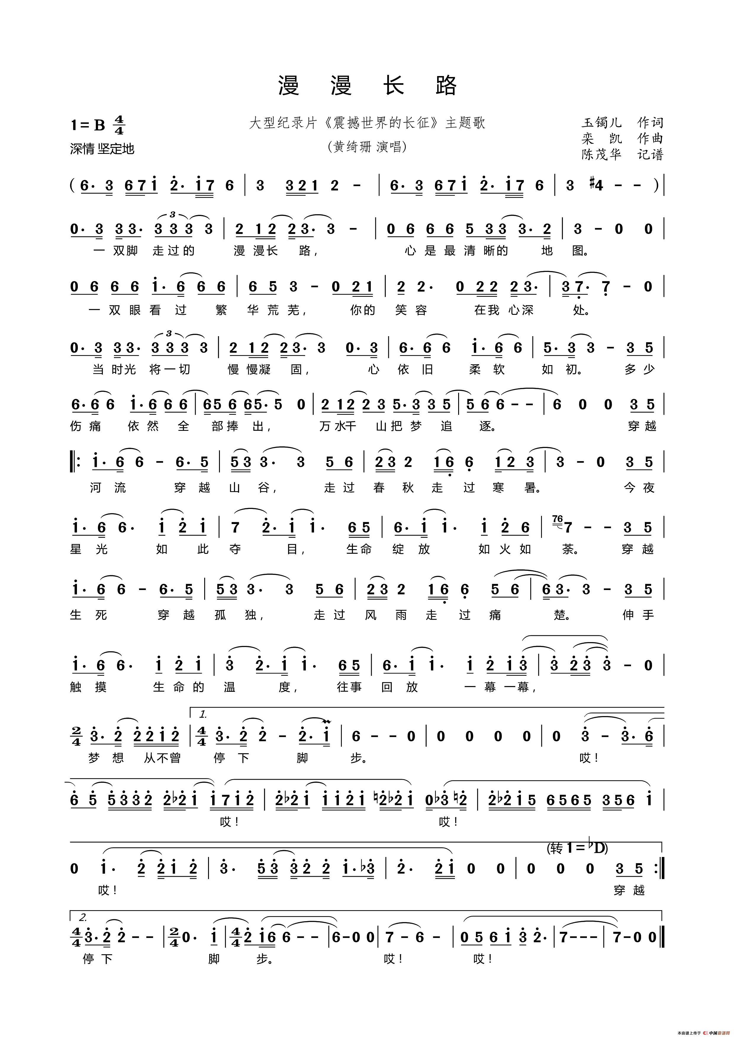 大型文献纪录片《震撼世界的长征》主题曲《漫漫长路》由央视军事节目中心专题部《军事纪实》团队策划,联袂著名作曲家栾凯、著名作词玉镯儿精心打造,由中国著名歌手黄绮珊深情演唱。该作品经过反复推敲与探讨,几易其稿,最终创作出了这首展现人类史上伟大征程的动人旋律,真挚抒发了红军将士对革命事业无限的深情和坚定。