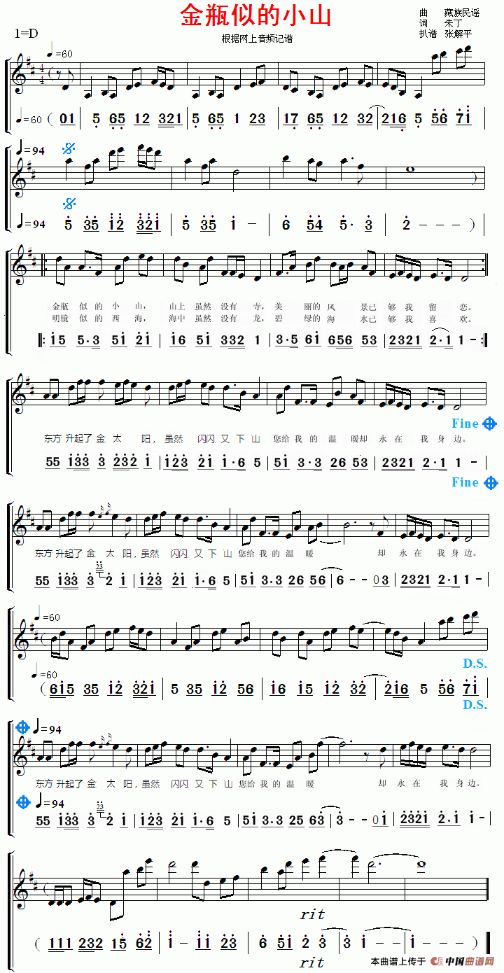 金瓶似的小山(带歌词、线简谱对照小提琴谱)
