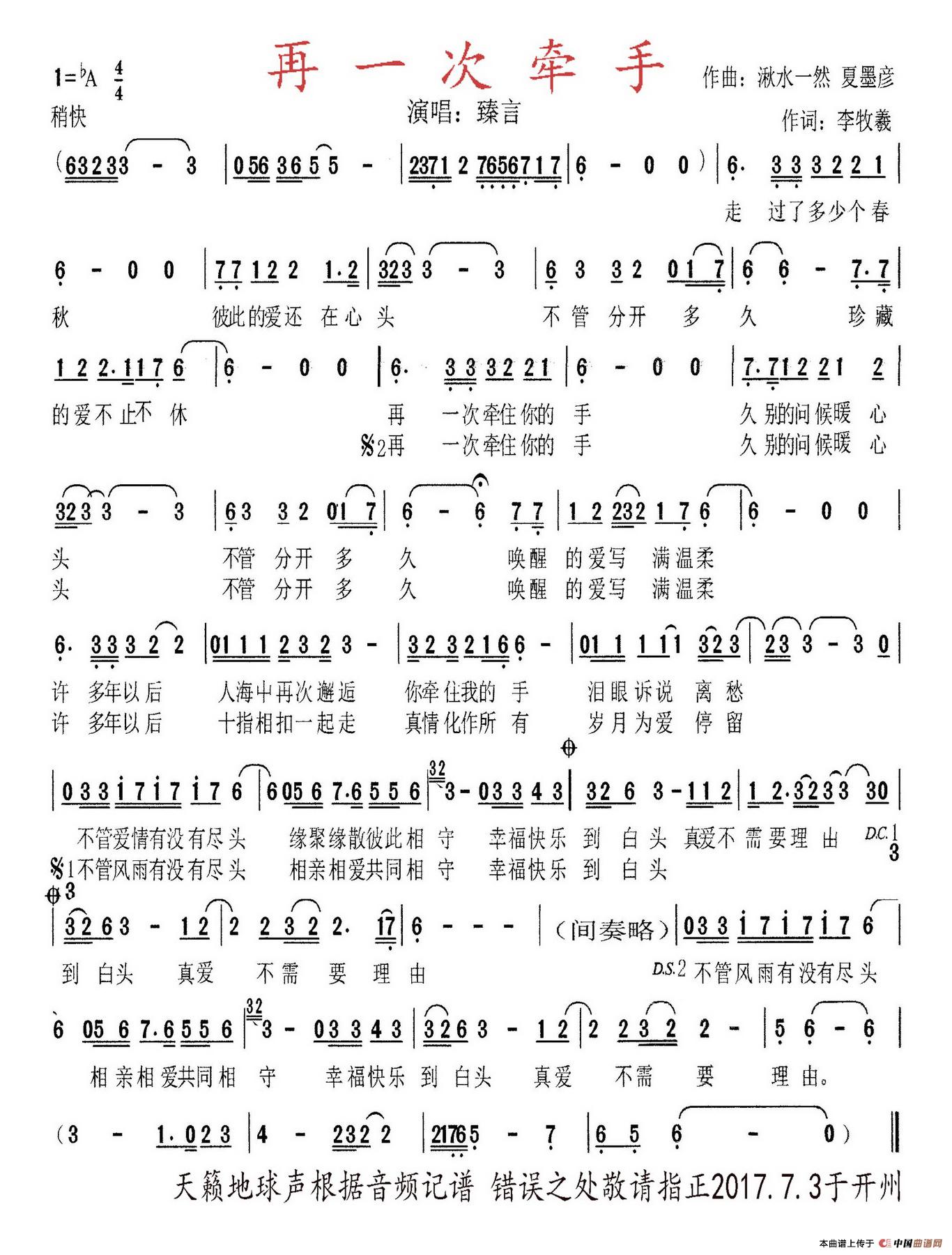关于《再一次牵手》曲谱的评论