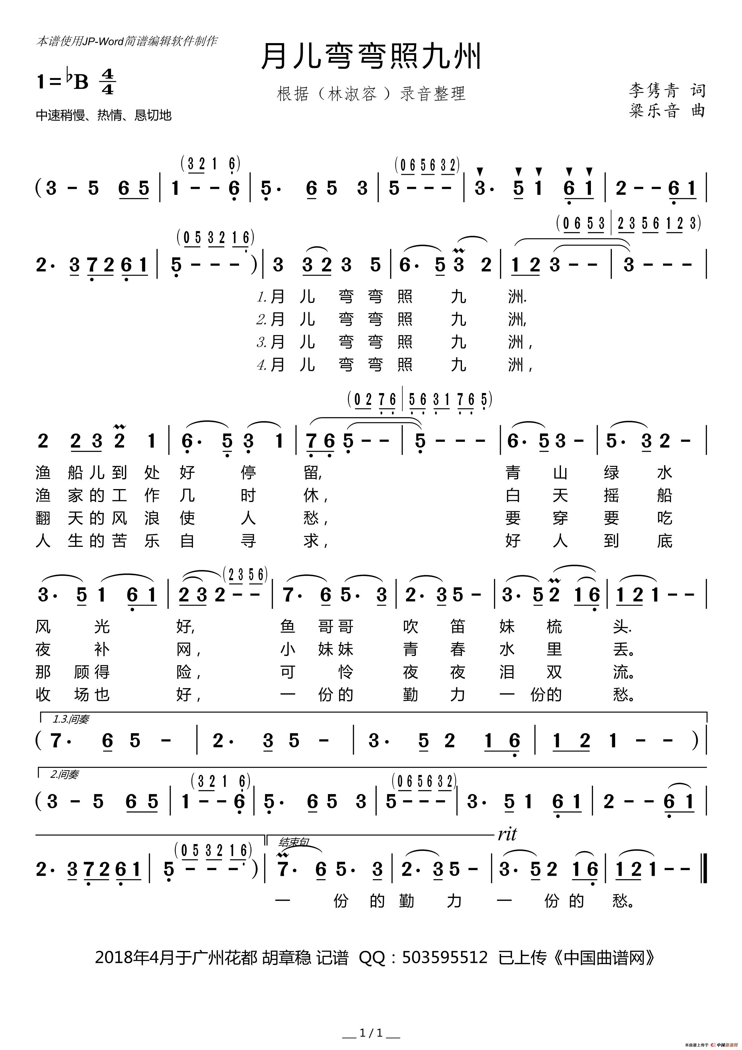 月儿弯弯照九州(林淑容演唱胡章稳记谱版)