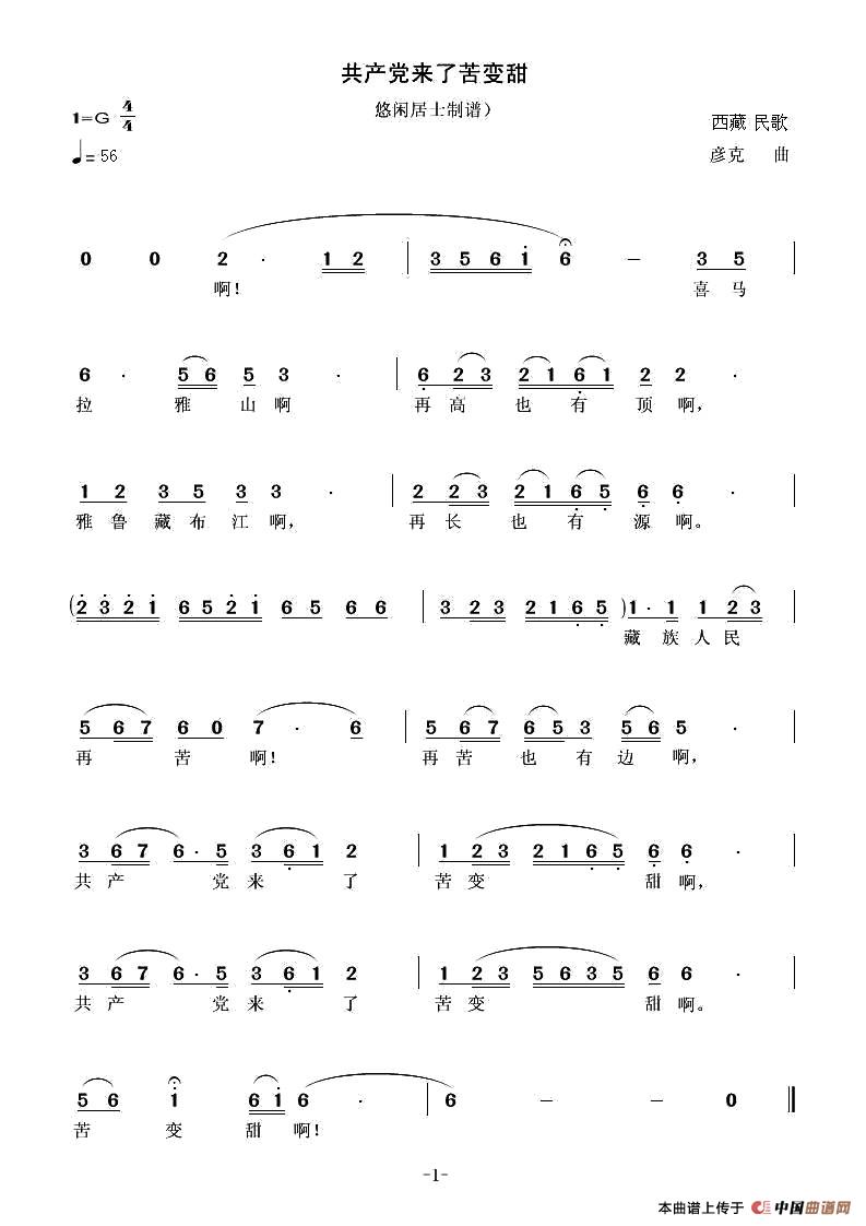 作曲:西藏民歌、彦克编曲 来源:谱友密云居士上传 上传:密云居士