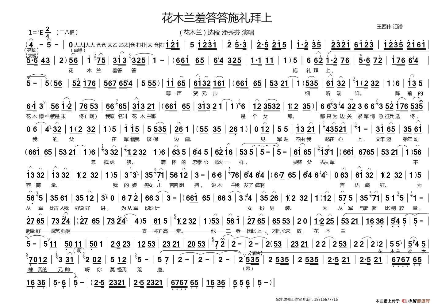 花木兰羞答答施礼拜上(豫剧《花木兰》选段、王西伟记谱版)