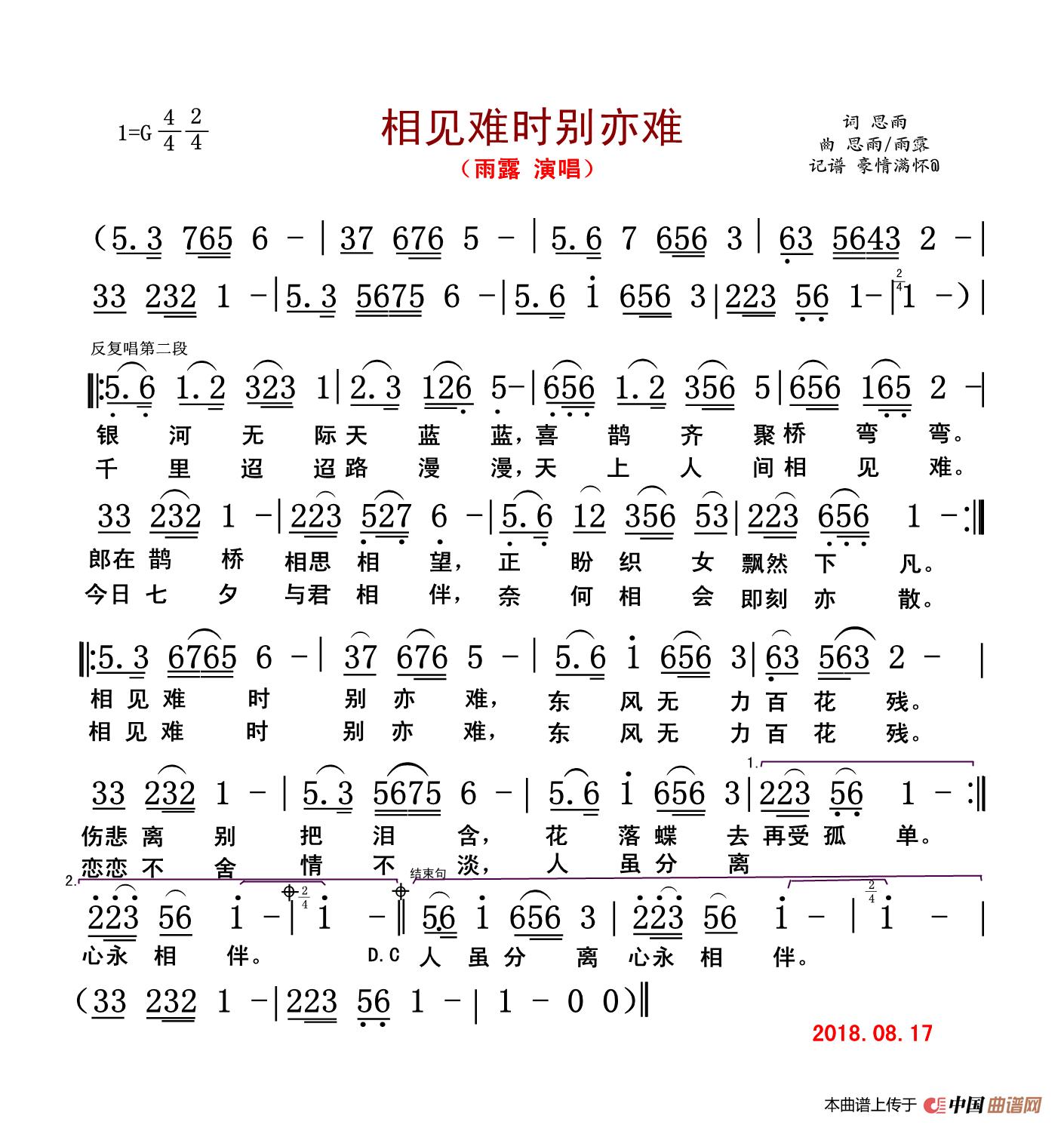 关于《相见难时别亦难》曲谱的评论
