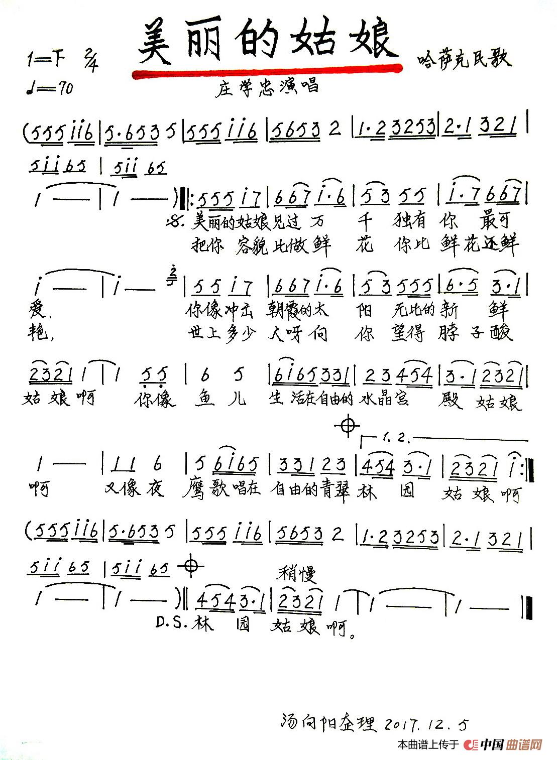美丽的姑娘(庄学忠演唱、汤向阳整理、手稿版)