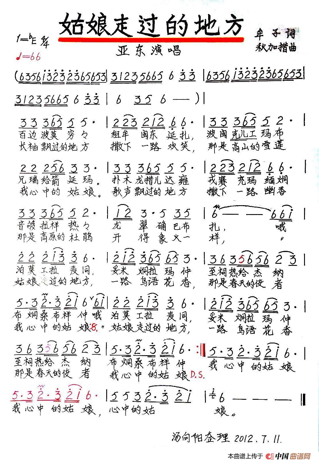 关于《姑娘走过的地方》曲谱的评论