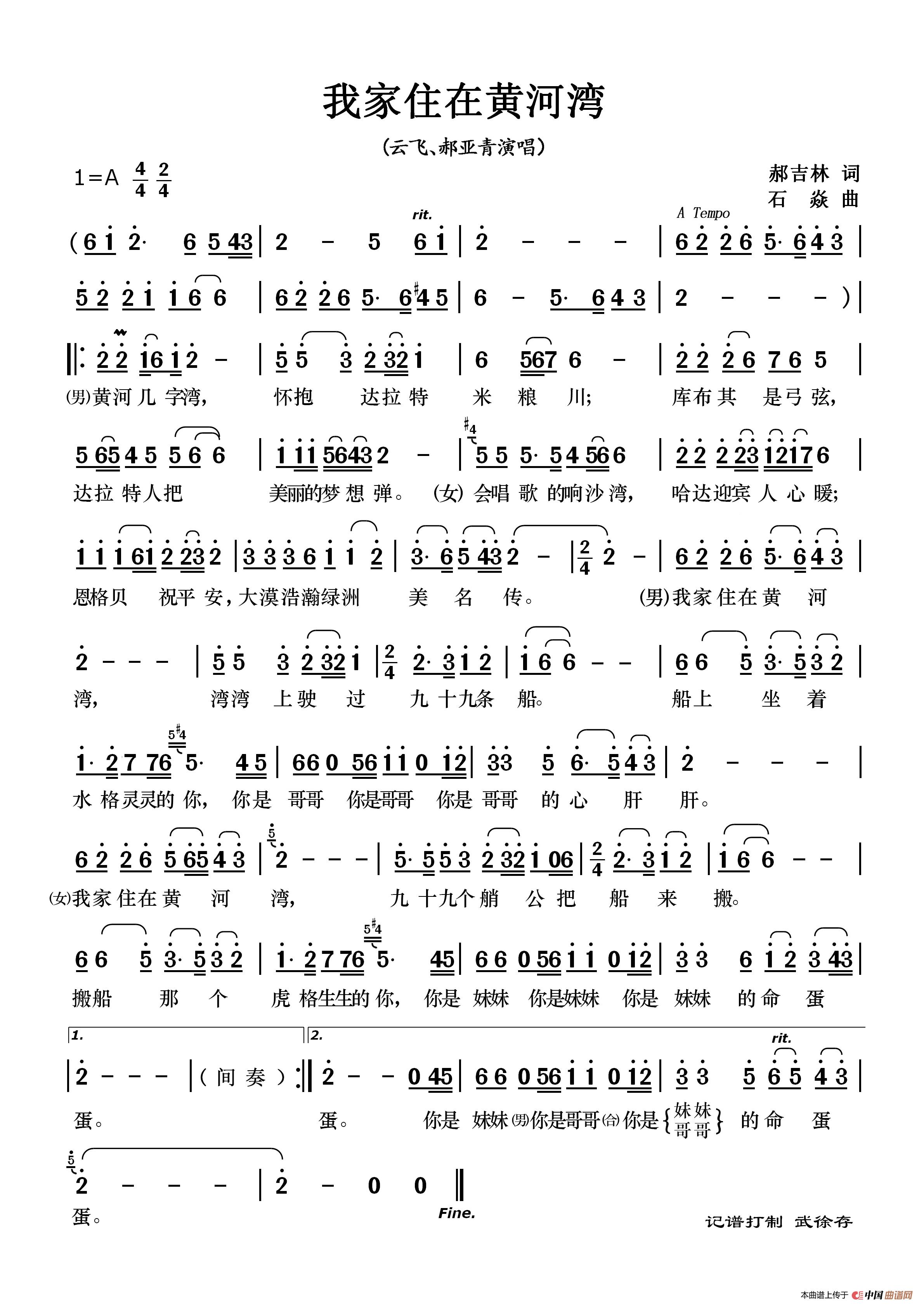 关于《我家住在黄河湾》曲谱的评论